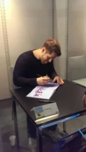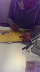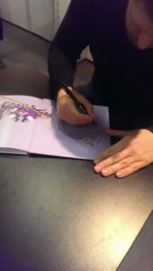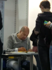 Nur um 15 Uhr sind wir zum Signierbereich, weil Joscha Sauer und Ralph Ruthe. Meine Schwester wollte UNBEDINGT Ihre Bücher signiert haben und Fotos. Also setzte ich mich dort auf den Boden und wartete 😀 Nach 1,5 Stunden war sie dann endlich fertig 😛 Und wir sind noch in Halle 4.2 gegangen da die Studenten dort zum Abendessen und Getränken geladen hatten. Particia macht ja gerade ihr Abitur und weiß zwar ungefähr was sie machen möchte, aber Informieren kann man sich ja dennoch. Und wir haben uns dort sehr nett unterhalten, lecker gegessen und so den Abend ausklingen lassen.