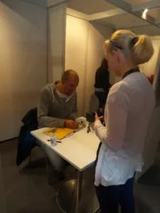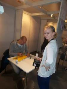 Nach einen kleinen Essen sind wir dann in den Finnland Pavillon, haben uns ein wenig umgesehen und fieberten dann unseren ersten Interview entgegen. Dieses führten wir dann um 17 Uhr mit Beile Ratut, einer finnischen Autorin. Sie wird ebenso noch einen extra Beitrag bekommen, in den ich sie und das Gastland der Buchmesse genauer beschreiben werde. Meine Schwester hat fleißig geholfen, da ich total Nervös war.